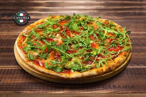 Casamia pitsakaste, mozzarella fior di latte, gorgonzola piccante, salame piccante, punane sibul, jalapeno, rukkola, pesto