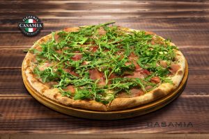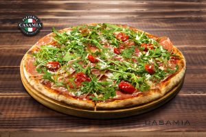 Casamia pitsakaste, mozzarella fior di latte, prosciutto crudo, pool päikesekuivatatud tomatid, rukola, grana padano, pesto